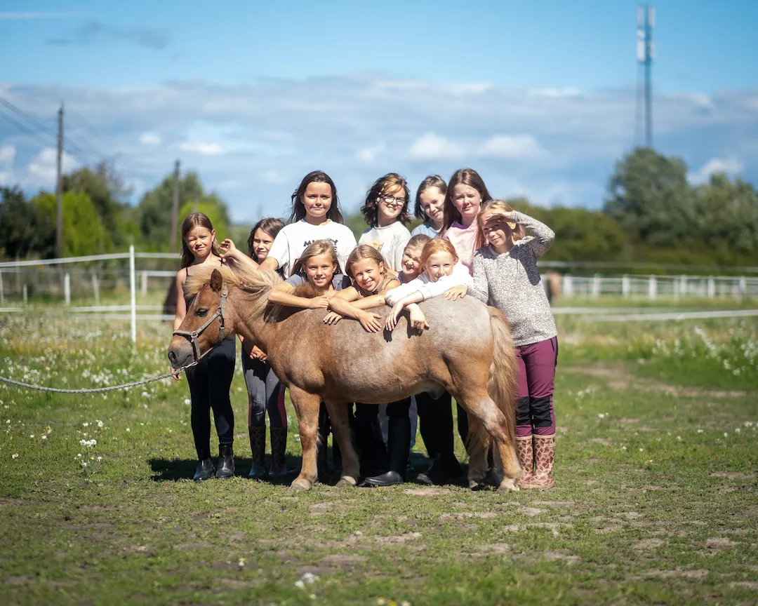 Barna får mulighet til å være gårdsarbeidere og lære om hestene/ponniene og husdyra på gården: kaniner, sauer, geiter, gris, kyllinger og høner